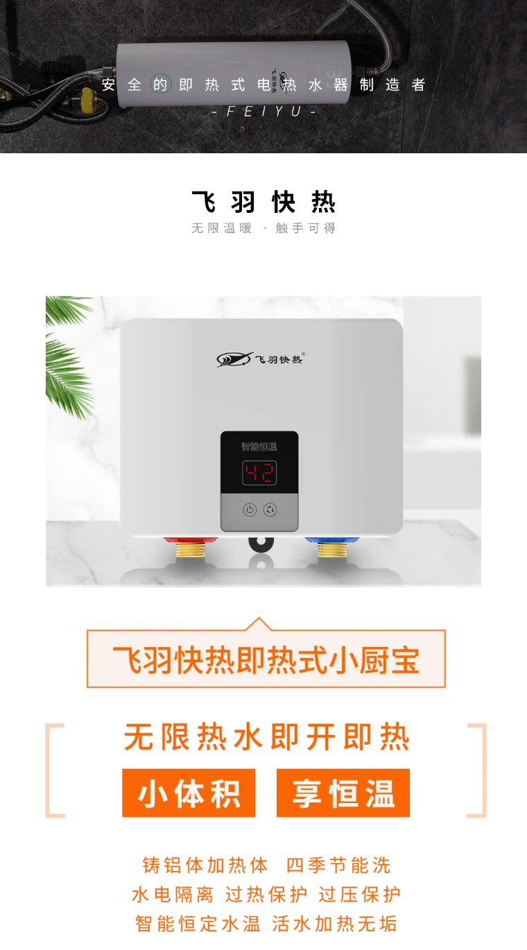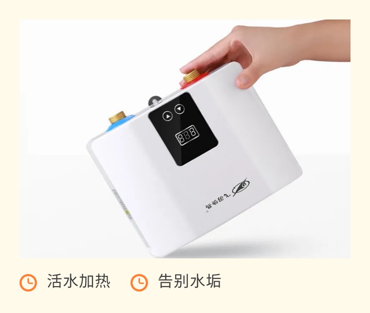 而即熱式采用的是活水加熱,冷水直接通過(guò)加熱體后便被加熱,水垢也不易形成,使用壽命比儲(chǔ)水式的小廚寶更長(zhǎng),用水也更健康放心。