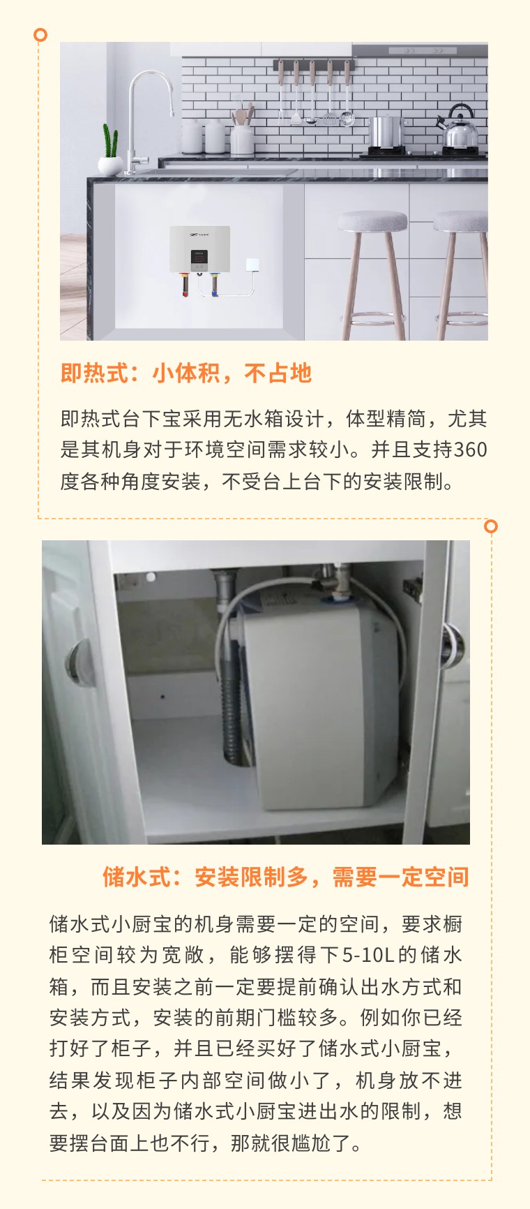 儲(chǔ)水式廚寶和即熱式廚寶都是裝在廚房里面,一般都是裝在水槽下方,盡量靠近出水端,提升了熱水傳輸?shù)睦寐省p少了傳輸過(guò)程中的熱量散失,也減少了每次使用前排冷水的水費(fèi)。