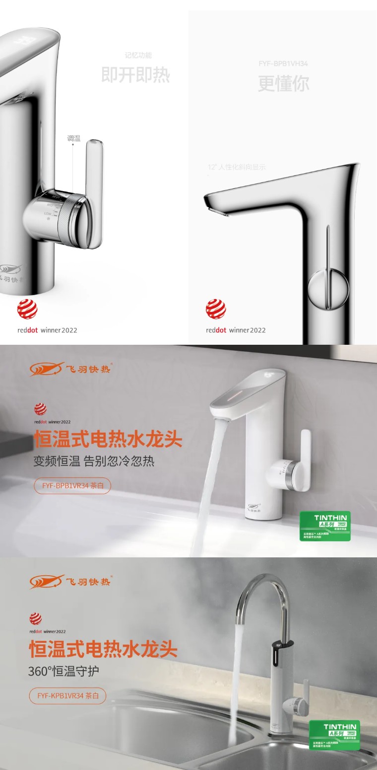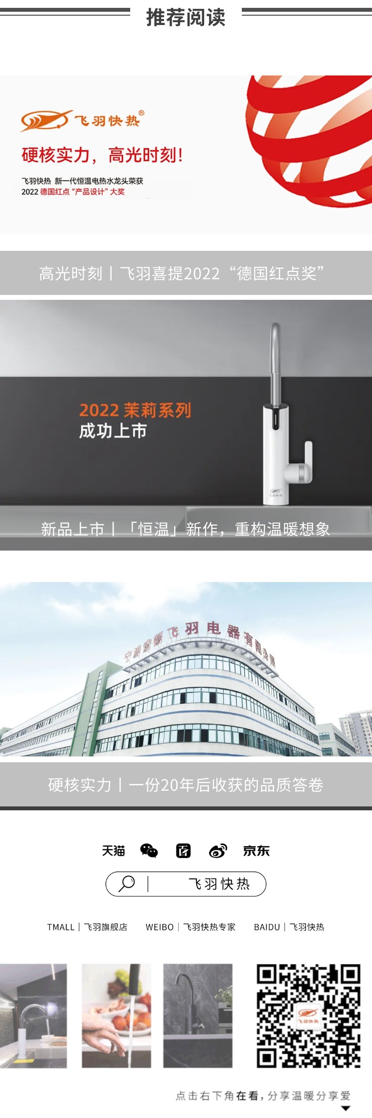 2022年新上市的恒溫電水龍頭·茉莉,搭載新一代霆芯A Series變頻恒溫安全內(nèi)膽,解決了傳統(tǒng)電熱水龍頭使用時水溫忽冷忽熱的痛點,一鍵即刻獲取恒溫熱水,打造業(yè)內(nèi)首款的“真恒溫”電熱水龍頭。該產(chǎn)品榮獲2022年德國紅點產(chǎn)品設計大獎,該獎項被譽為“設計界的奧斯卡”,也是全球公認的工業(yè)設計殿堂級獎項。