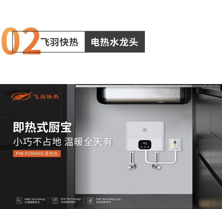 告別傳統(tǒng)熱水管傳輸?shù)馁M時費水,飛羽快熱即熱式小廚寶熱水更快,也更省電,機身迷你小巧,使用場景靈活多變。無論在廚房、衛(wèi)生間或者是陽臺,只要有冷水管和電源,小廚寶都可以提供源源不斷的熱水,方便人們隨時取用。