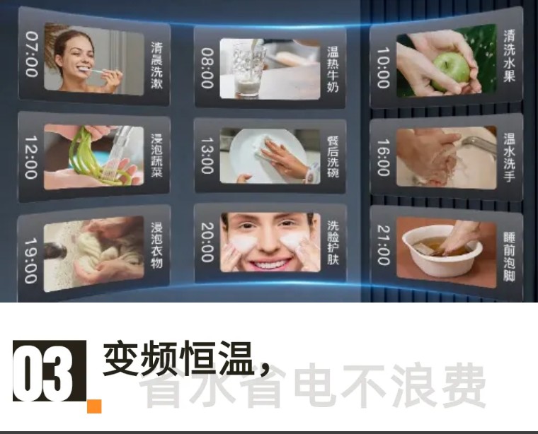 搭載智能變頻恒溫技術(shù),自動感應(yīng)進(jìn)出水溫度,靈活調(diào)節(jié)加熱功率:入水溫度高,自動降低加熱功率,省電防燙;入水溫度低,自動升高加熱功率,補(bǔ)足溫暖。控溫精準(zhǔn)在±1℃之間,有效恒定水溫,告別忽冷忽熱。