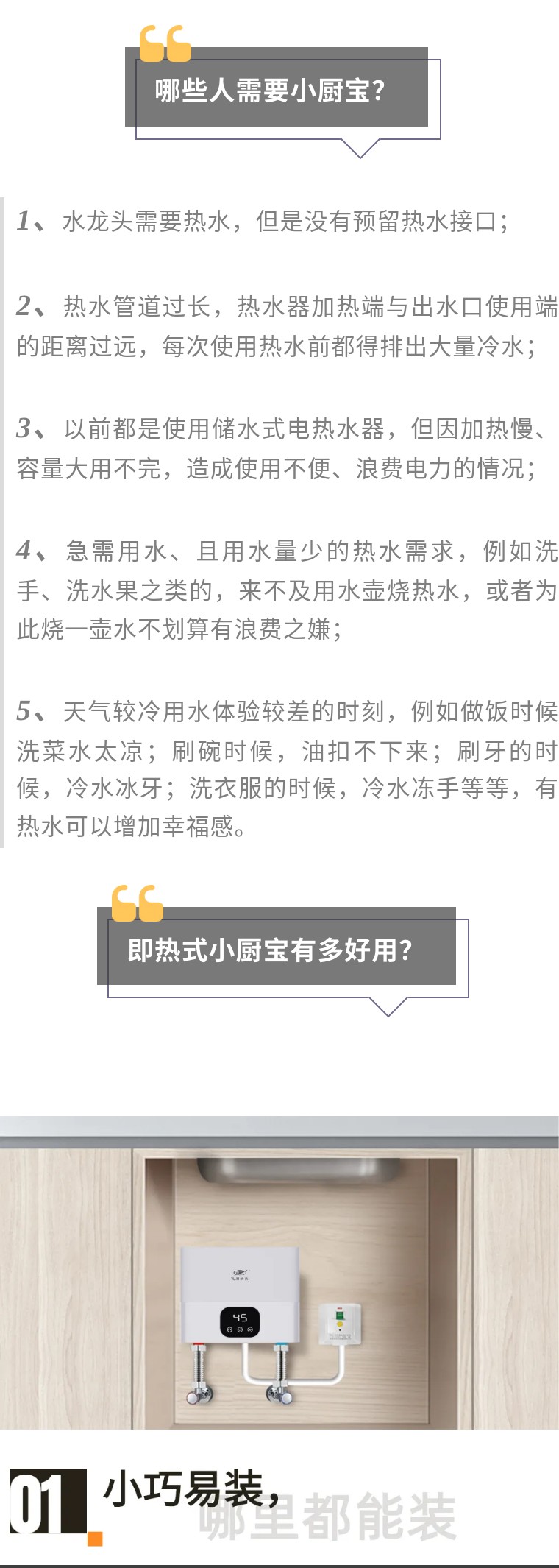 這種迷你廚寶不僅不占地方,且無需預(yù)熱打開就能用。直接接上自來水,通過電力加熱,一般打開工作幾秒就出熱水,完美克服因熱水管太長、熱水器距離太遠(yuǎn)需要長時間放冷水的弊端。告別“等水五分鐘,用水三分鐘”的長久等待,打造接近“零冷水”的溫暖體驗(yàn)。