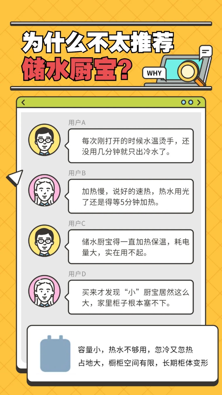 而且許多用戶使用后反饋,儲水式小廚寶的能耗很高,為了保持水溫,內(nèi)膽里的水不斷被反復(fù)加熱,家里的電費都在蹭蹭蹭得上漲。長時間工作,機器的壽命也被縮減。