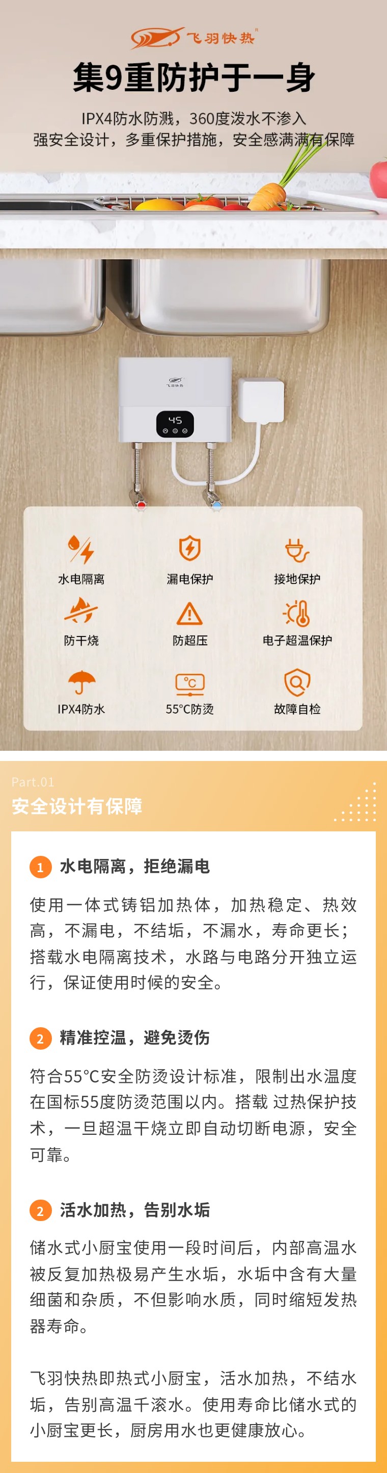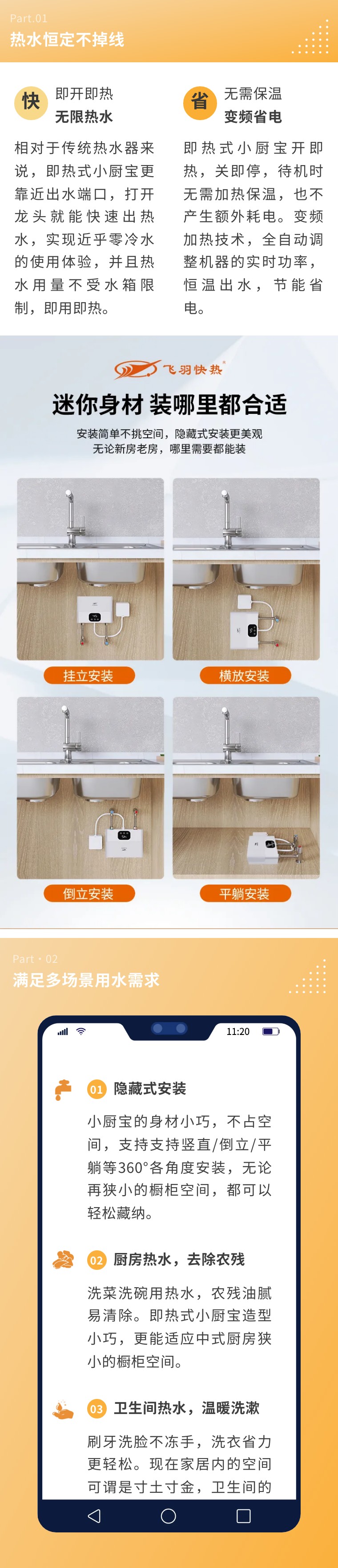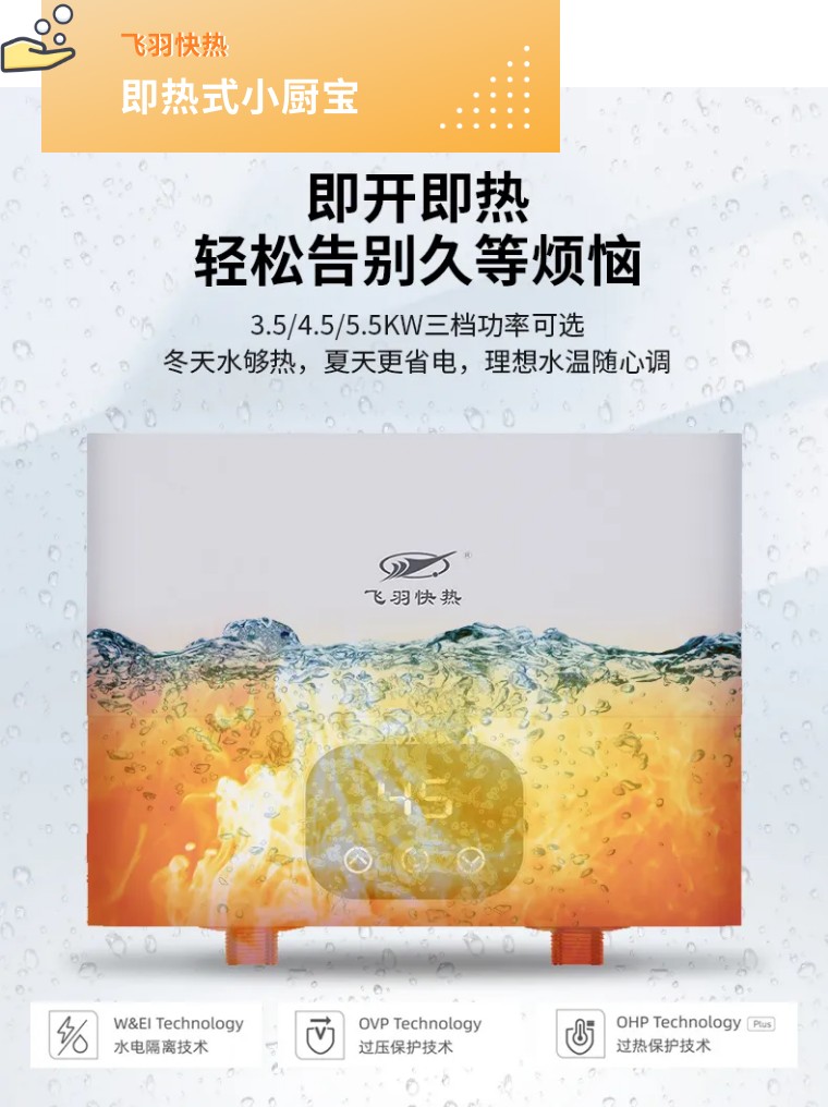 無論在廚房、衛(wèi)生間或者是陽臺(tái),只要有冷水管和電源,飛羽快熱即熱式小廚寶都可以提供源源不斷的熱水,方便人們隨時(shí)取用。告別傳統(tǒng)水管傳輸?shù)馁M(fèi)時(shí)費(fèi)水,小廚寶熱水更快,也更省電,使用場景靈活多變。