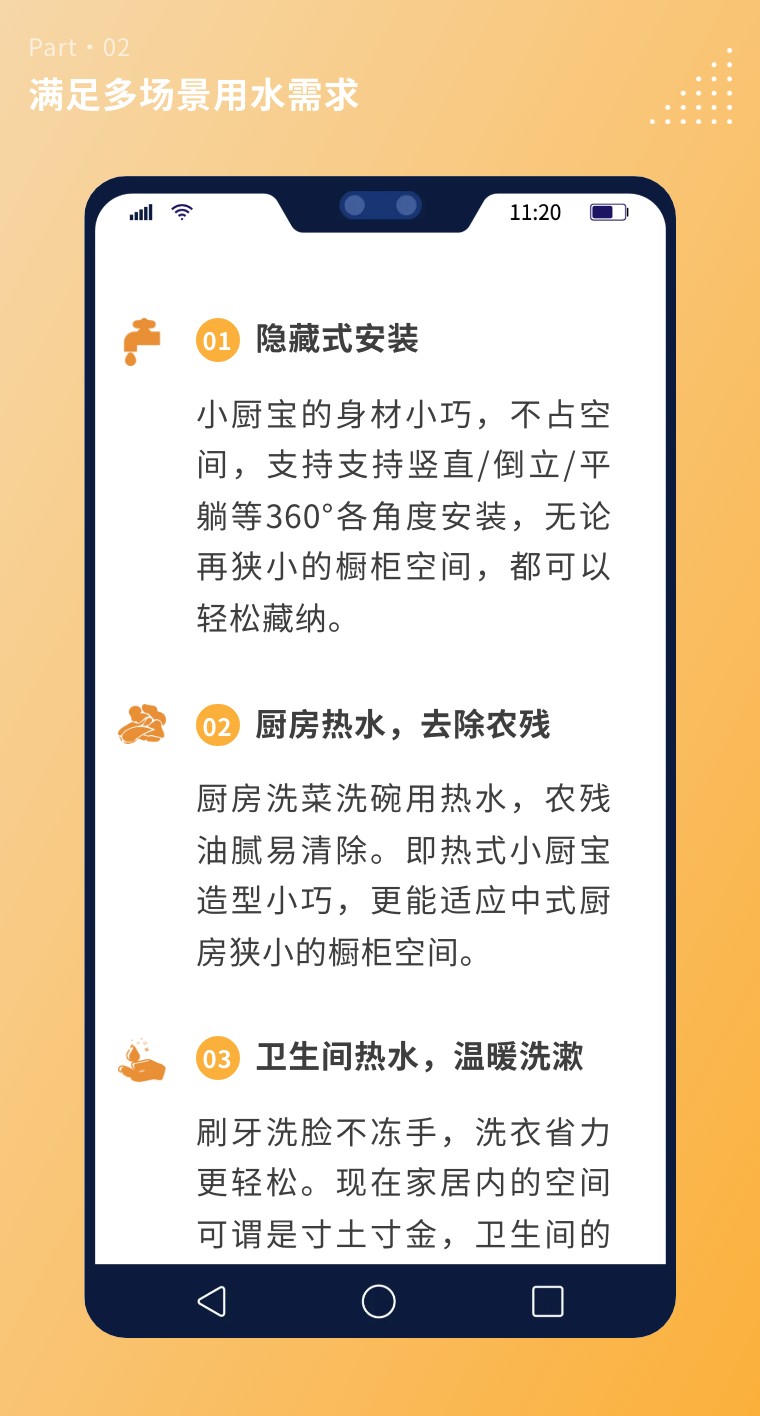 即熱式小廚寶既可以用于洗手、刷牙這種多頻次、用水少的短時(shí)熱水,也可以滿足洗碗洗衣服這類長時(shí)間、大水量用水需求。靈活適用多種場合,沒有熱水用量限制。搭載的變頻恒溫系統(tǒng),不僅可以恒定水溫,也可以用作熱水器補(bǔ)熱,省電省水,提升體驗(yàn)。